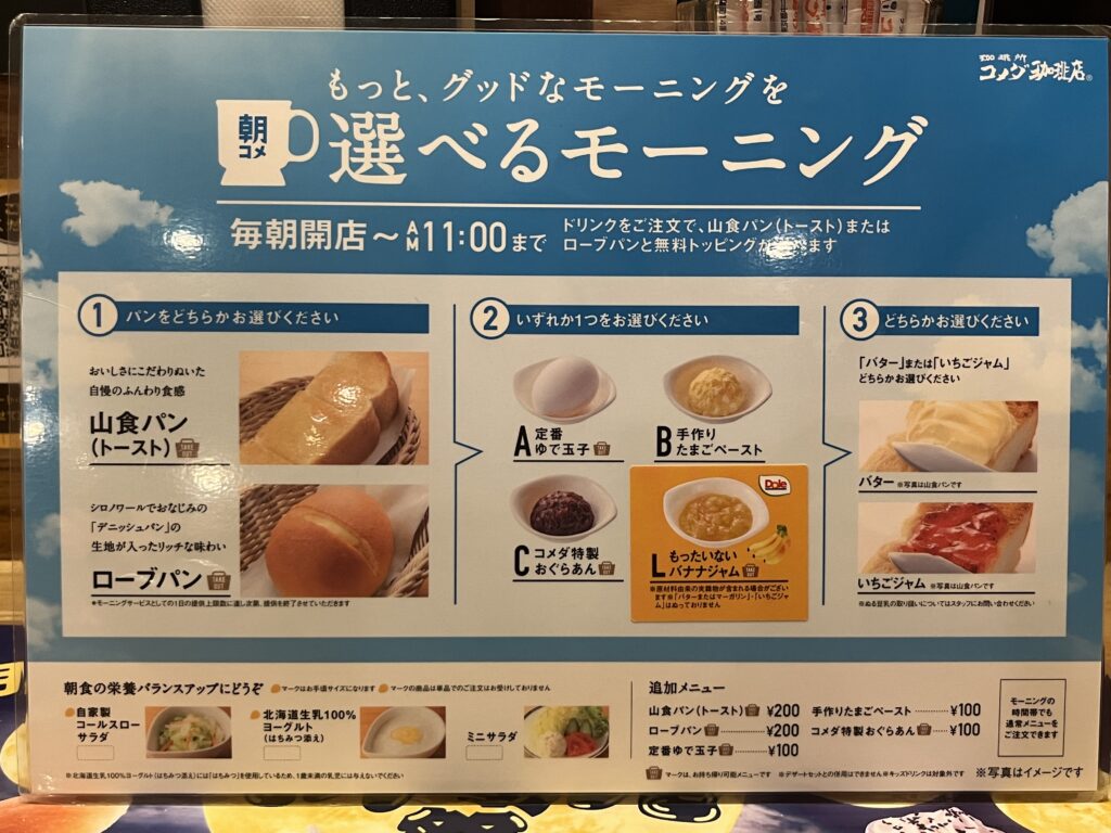 コメダ珈琲店では、朝11時まではドリンクをを注文するとモーニングがついてきます。モーニングでは、パンは山食パンorローブパン、トッピングとしてゆで玉子orたまごペーストorおぐらあんから選ぶことができます。パンには、バターorいちごジャムを塗ってもらうことがでます。