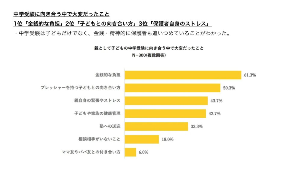 中学受験において、サポートする親自身の多くがストレスを感じていることがわかります。特に、お子さんと一緒にいる時間の長いママたちの大変さはかなりものになるでしょう。