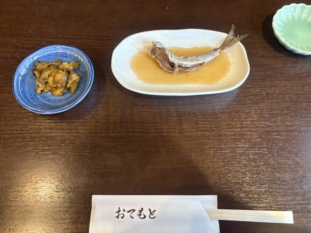 注文してから5分ほどで、それぞれに鰯の煮付けとお漬物が並べられました。程なくして運ばれてきたのが鰯の天ぷら。