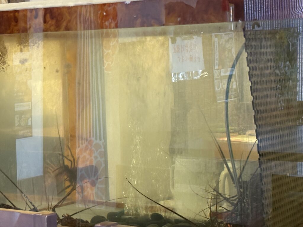 到着したのは、土曜日の12時半頃。私たち3人以外には誰もお客さんはいませんでした。店内は天井が高く小上がりになっていてテーブル席があり、奥にはカウンター席があります。いけす料理というだけあって、店内には水槽が置かれ、写真は見えにくいですが伊勢海老がいますね。