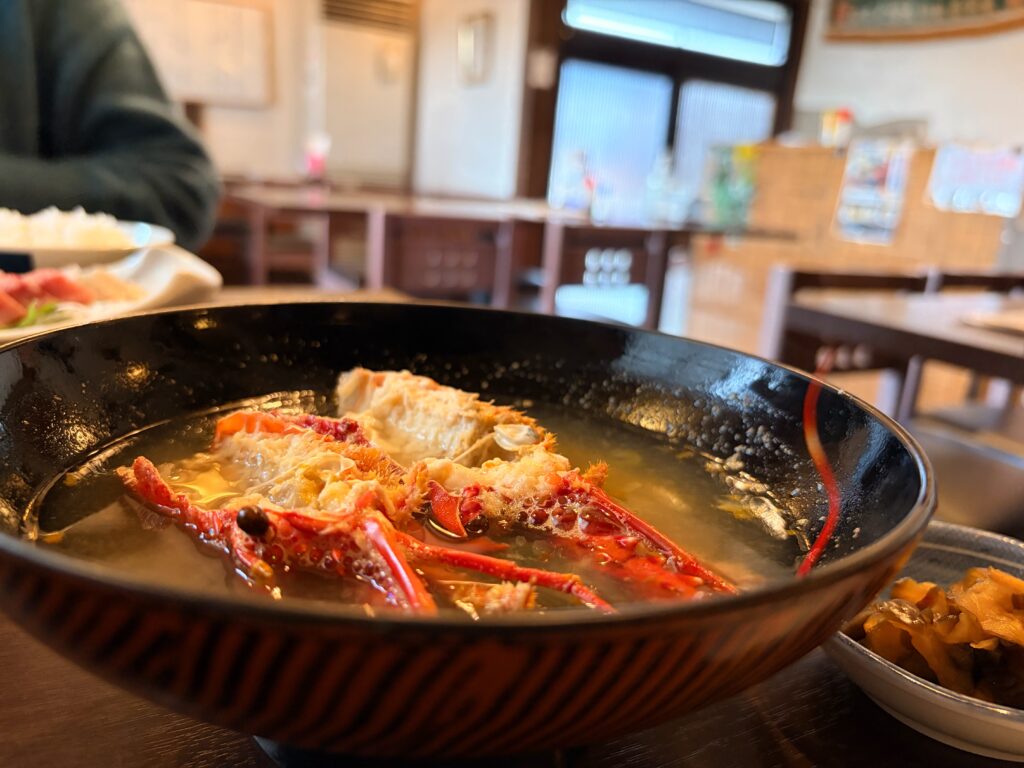 道路沿いの看板には伊勢海老天丼には元祖という文字があったのでお店の一押しかと思います。確かに伊勢海老の天ぷら自体珍しいかも。お店の入り口の立て看板のおすすめはお刺身定食とありましたが、店内には伊勢海老天丼と期間限定のはまぐり御膳のポスターありました。
