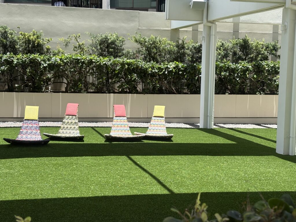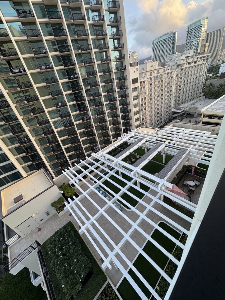 ラナイの右側から見下ろした8階屋外の様子です。ザ・ガーデンが見えます。ここで宿泊中に参加したヨガが行われました。