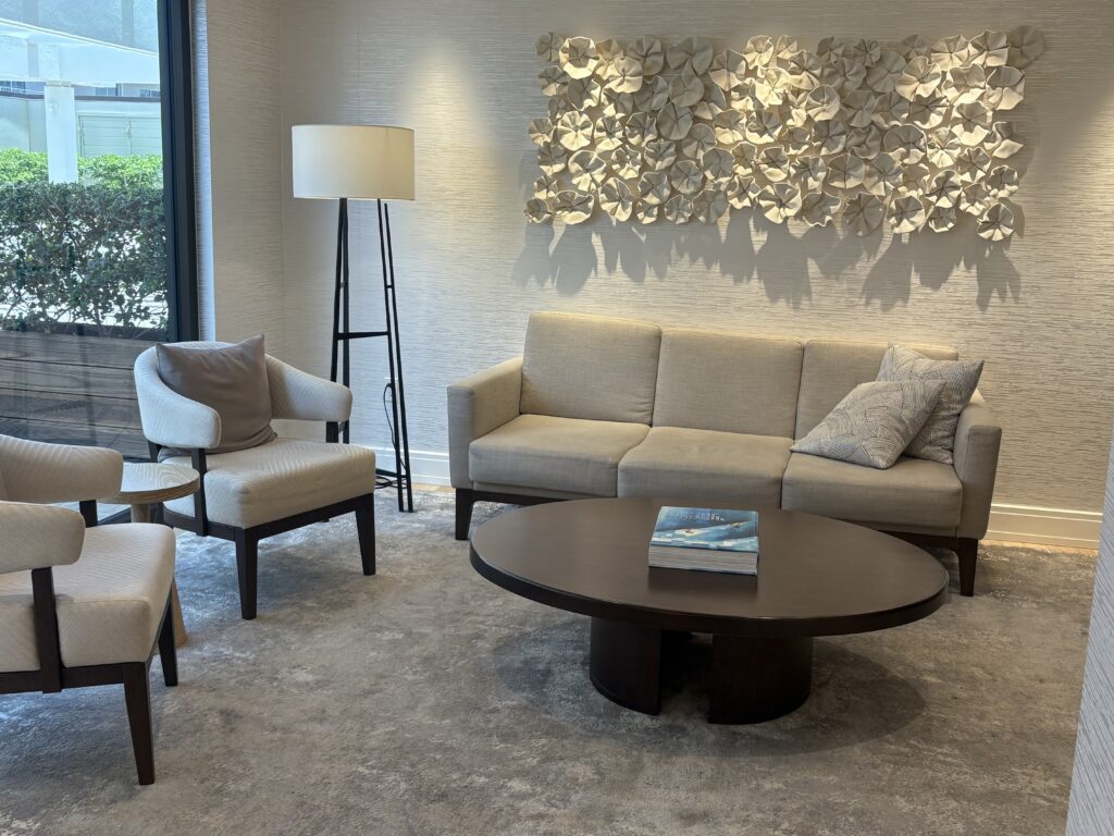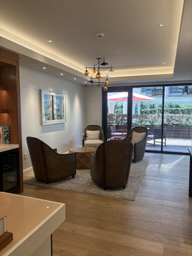 チェックインは15時からなのですが、ホテルに到着したのは12時ころ。さすがにまだお部屋の用意はできていなかったので、荷物だけ預かってもらいました。ランチの予約13時半にはまだ時間があります。ホテル8階のホスピタリティースイートで休憩させてもらいました。