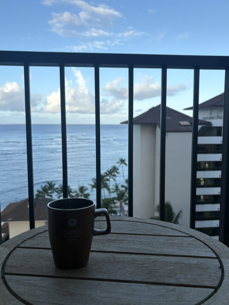 『朝早く起きてラナイでコーヒーを飲む』を体験中の写真です。ラナイはあまり広くなくて、14階から下を見るとちょっと怖い気もしますが、海が見えるこの景色は最高♪