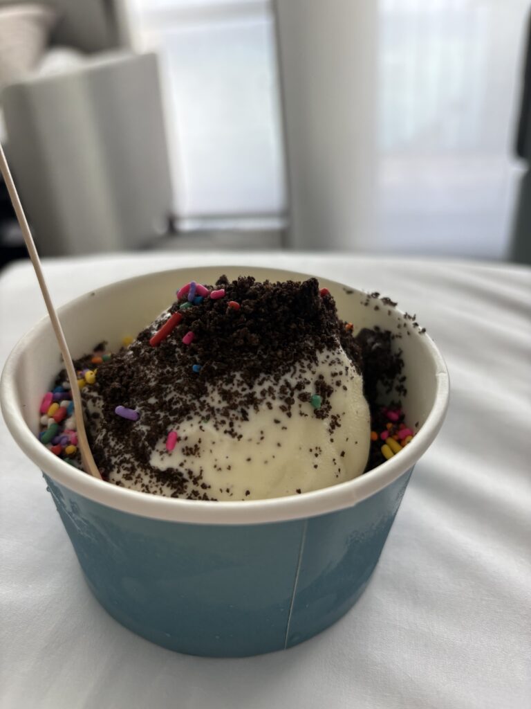 他にも、滞在中にホテルのロビーでアイスクリームが振る舞われました。お部屋に持ち帰り。ゆっくり食べました。大きすぎるホテルでは、エレベーターも時間帯によってはかなり混み合うところが多いのですよね。ハレプナはエレベーターが3基。ハレプナでは、さほど待つことなくすぐにエレベーターに乗ることができます。もちろんアイスも無料でした。