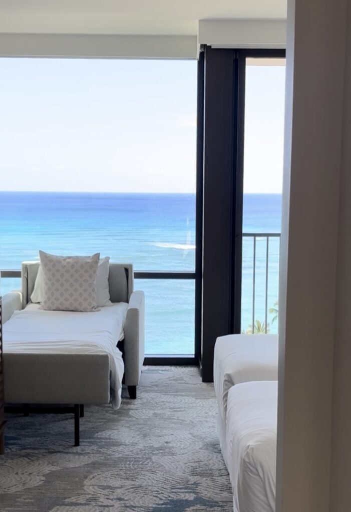 目の前にワイキキの海が広がります✨ワイキキマウンテンビューで予約していましたが、ちゃんとオーシャンビューのお部屋にアップグレードされていました。今回は3人での宿泊なので、ソファベッドが1つ用意されています。