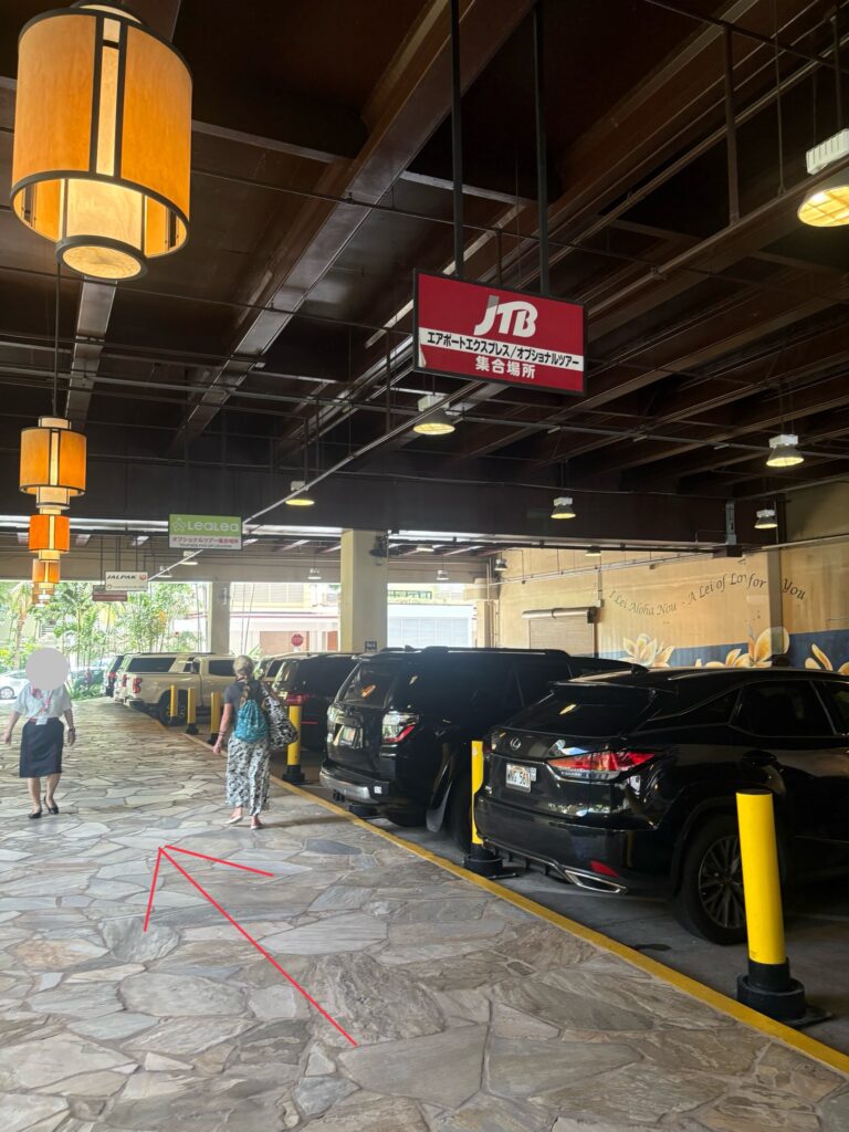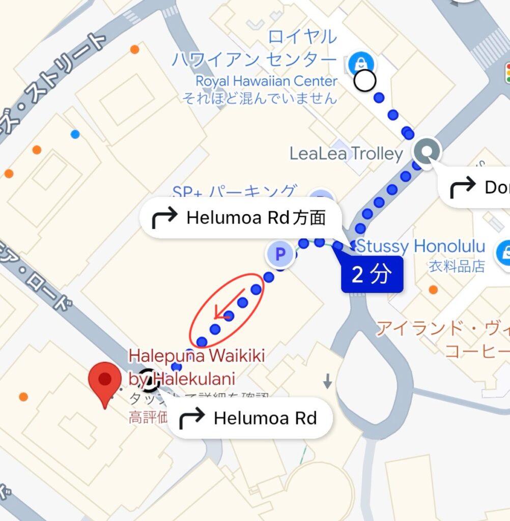 ワイキキを訪れたら誰もが1度は行くと思われる、ロイヤルハワイアンセンターまで 2、3分。ホテル前の道路を渡って、アロハランディングを通って行くとすぐです。地図と写真の赤い矢印は、ロイヤルはハワイアンセンターからハレプナに向かうものです。