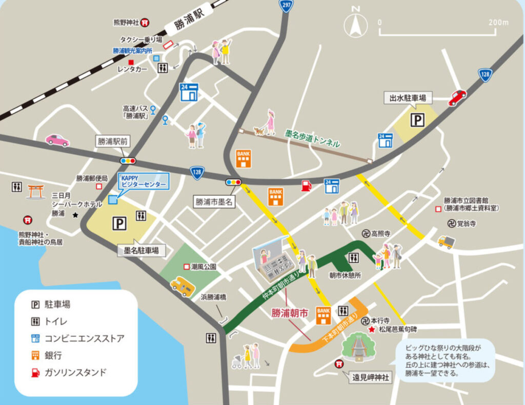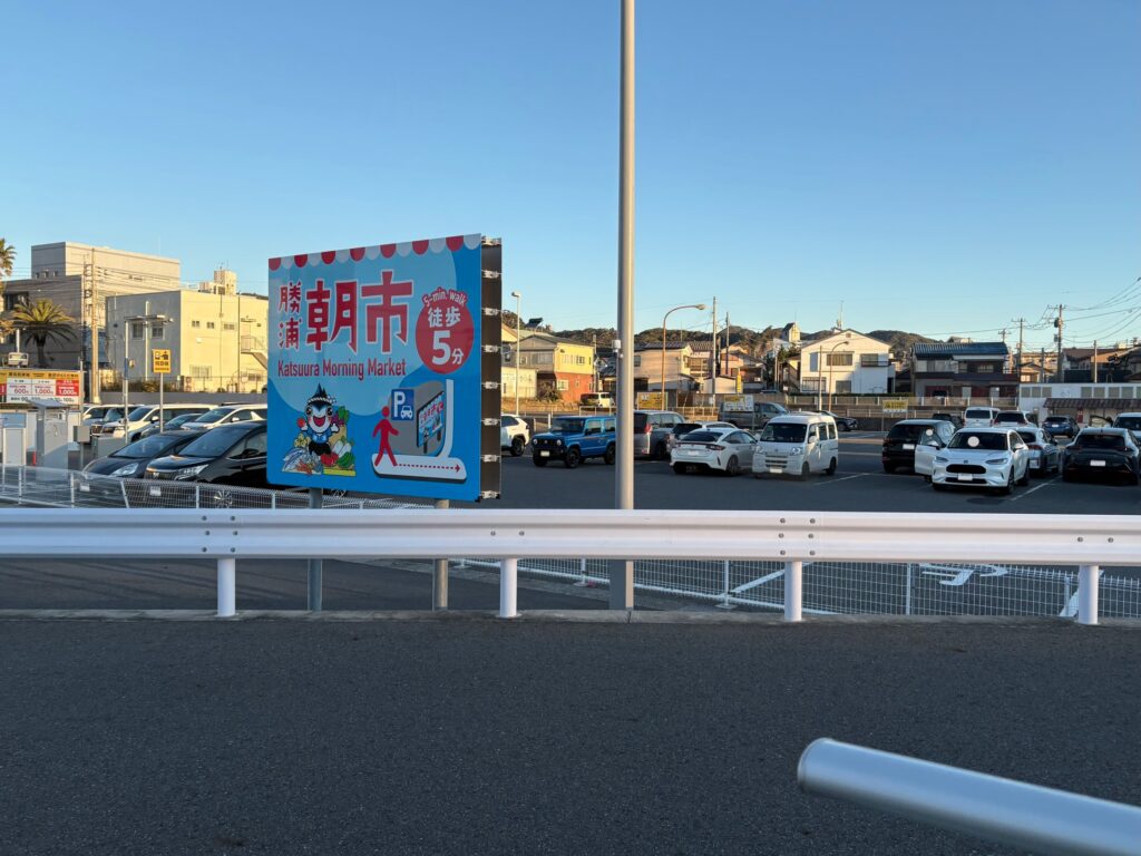 三日月シーパークホテル勝浦から歩いて朝市に向かいましたが、他にもホテルの宿泊客の方も朝市に向かう姿がちらほら。朝市開催場所までは迷うことなく到着。三日月シーパークホテル勝浦の目の前に、墨名駐車場(タイムズ)があります。駐車場から朝市開催場所までは約5分。