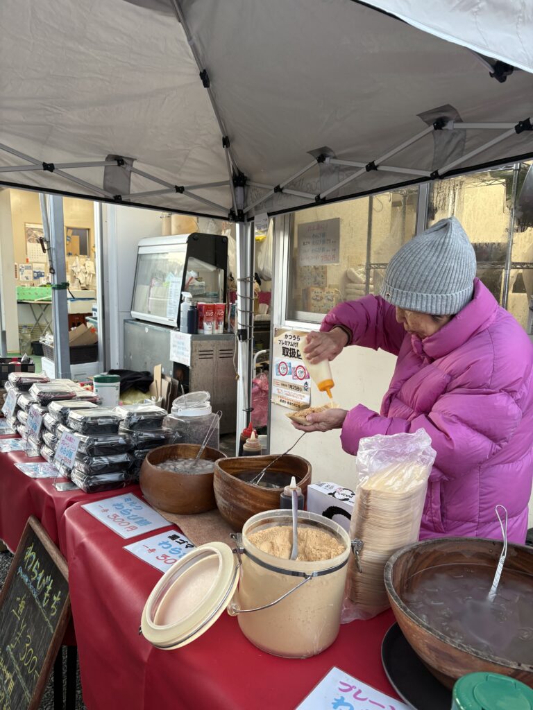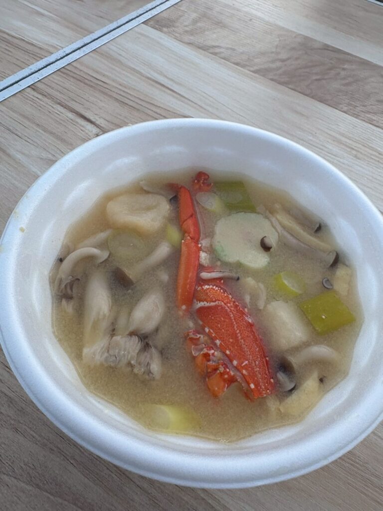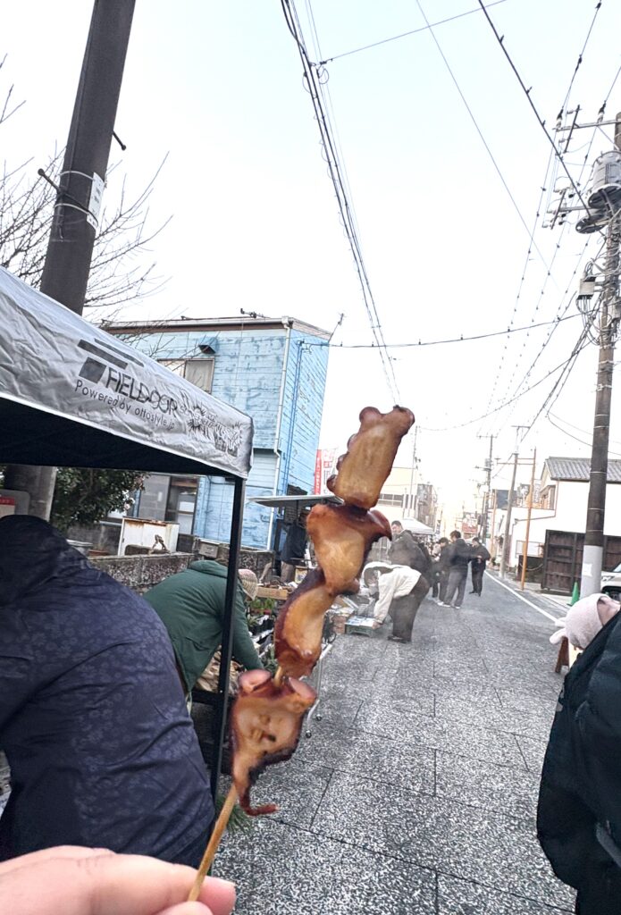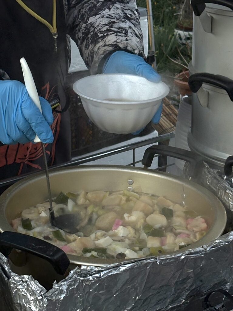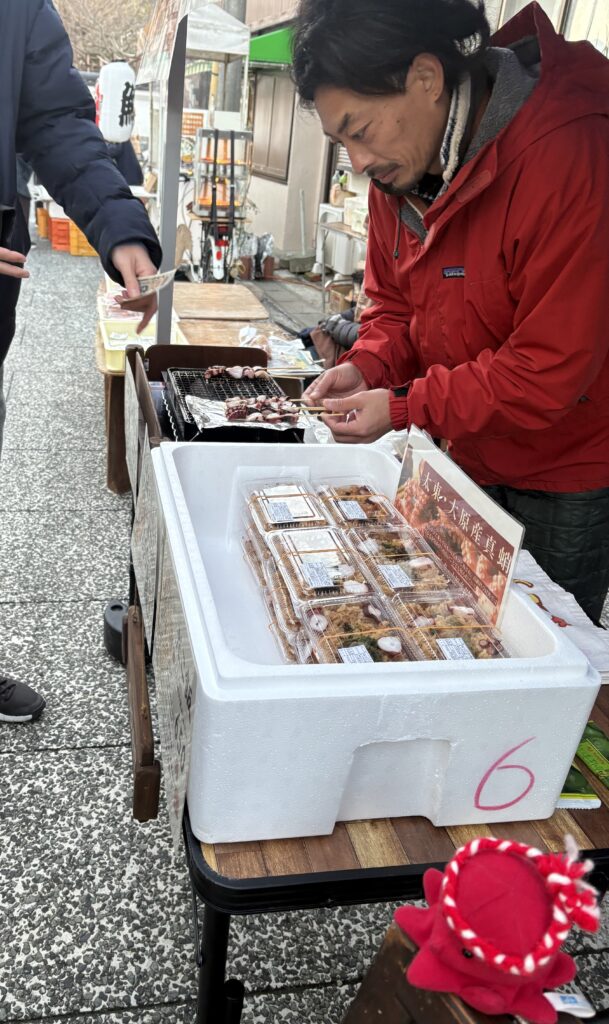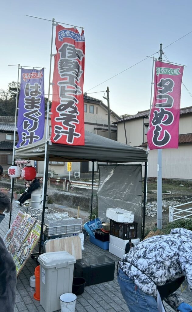 伊勢エビの味噌汁、はまぐり汁、タコ飯、牡蠣など、海鮮付きにはたまらないメニューが並びます。伊勢海老の漁獲量日本一となった千葉。中でも、勝浦からいすみ市にかけて水揚げされる全長13センチ超の伊勢海老は千葉ブランド水産の「外房イセエビ」に認定されているのだそう。大東・大原産真蛸に加えて、外房伊勢エビまでいただけるとは、さすが勝浦朝市‼️冷えた体に、伊勢海老の出汁がしみます。出店日は海幸さくら屋さんのXで確認できます。特典もありますよ!