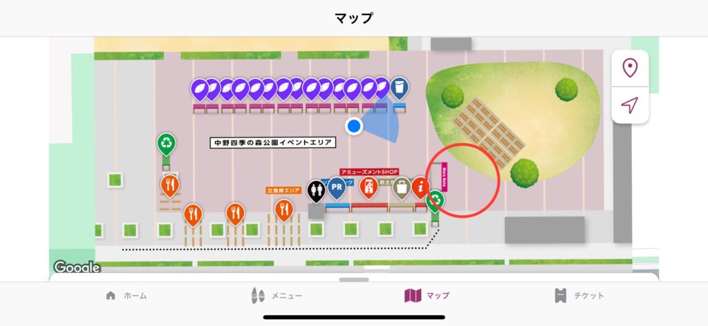 下のマップ赤丸のゲートから入っていくと、左にはインフォメーション、お土産売り場、グッズ売り場、カプセルトイのテントが並んでいます。右には、お店がずらりと並び、みなさん思い思いお店の前の列に並んで購入するシステム。