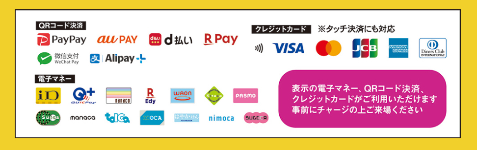 メニュー購入の際は、現金は使えません(カプセルトイは現金のみ)。下記の決済方法以外には、前売りチケットが使用できます。
